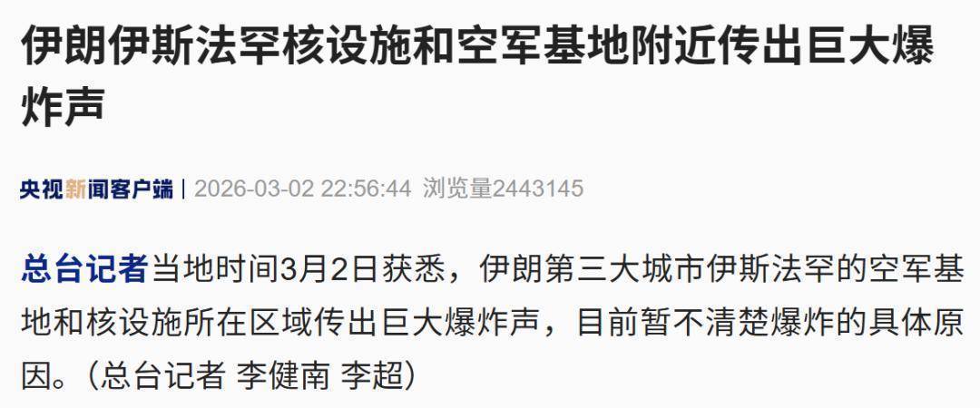 总台记者 当地时间3月2日获悉,伊朗第三大城市伊斯法罕的空军基地和核设施所在区域传出巨大爆炸声,目前暂不清楚爆炸的具体原因。 来源:央视新闻